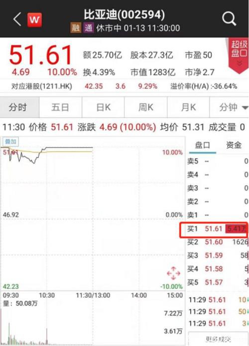 截至午盘收盘,比亚迪报收51.61元,超5万手买单封在涨停板上,成交超25亿元,市值高达1283亿元。