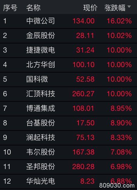 截至收盘,中微公司(行情688012,诊股)(科创板)上涨16.02%,板块内还有5只个股涨停,分别为金辰股份(行情603396,诊股)、捷捷微电(行情300623,诊股)、北方华创、国科微(行情300672,诊股)、汇顶科技(行情603160,诊股)。博通集成(行情603068,诊股)、台基股份(行情300046,诊股)、澜起科技(行情688008,诊股)均涨逾8%。