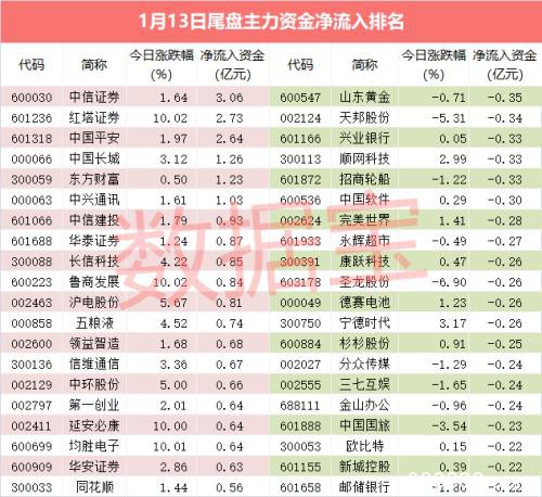 有6股尾盘主力资金净流入超亿元,分别是中信证券(行情600030,诊股)、红塔证券(行情601236,诊股)、中国平安、中国长城(行情000066,诊股)、东方财富(行情300059,诊股)、中兴通讯(行情000063,诊股)。中信证券尾盘主力资金净流入3.06亿元居首,该股今日上涨1.64%。红塔证券紧随其后,尾盘净流入资金2.73亿元,该股尾盘涨停。