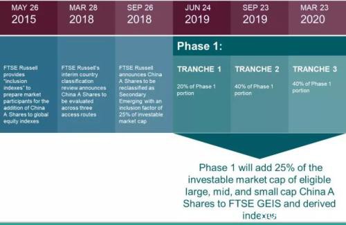 据富时罗素此前的安排,A股“入富”的第一阶段分为三步走:2019年6月是第一步,A股实现首次纳入其指数体系,纳入比例为20%,2019年9月份纳入40%,2020年3月份纳入40%,涵盖大、中、小股票,,A股纳入比例将分别为可投资部分的5%、15%、25%。