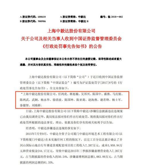 2018年1月5日,中毅达发布公告称,中国证监会发布《行政处罚事先告知书》,公告中毅达全资子公司厦门中毅达环境艺术工程有限公司(简称“厦门中毅达”)涉嫌虚增利润总额1063.89万元,中毅达及相关负责人累计被罚186万元。