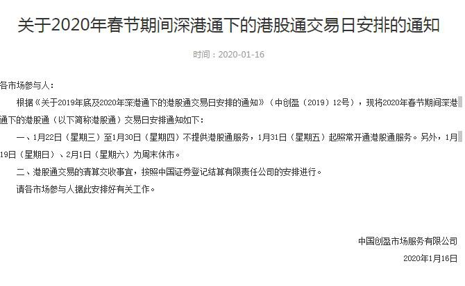 深交所发布2020年春节期间深港通下的港股通交易日安排。