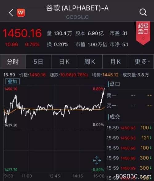 谷歌母公司Alphabet股价周四收报1450.16美元,涨幅0.76%,刷新历史新高,成为继苹果、亚马逊、微软后第四个市值突破一万亿美元的美国科技巨头。
