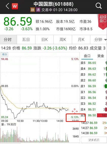同时,市值仅1600多亿的龙头股中国国旅当天也出现了大跌,盘中一度跌超5%以上。截至下午两点三十分左右,中国国旅股价报收86.59元,股价跌幅超3.63%。