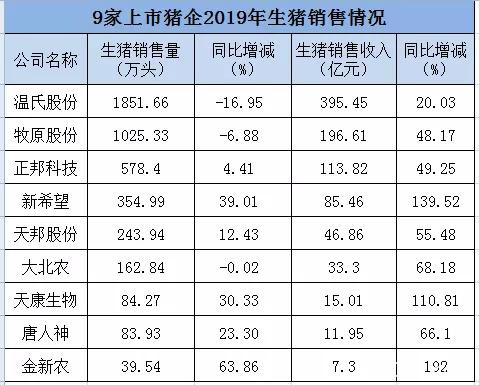 据不完全统计显示,截至目前有9家上市猪企披露2019年生猪销售简报,公开了2019年全年的生猪销售量和销售收入。