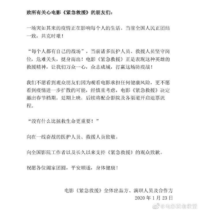 最后《唐人街探案3》也撤档,声明表示,对于已经购票的观众,我们将尽快配合票务平台完成退票服务,给您带来的不便深表歉意。平安健康是所有人共同的心愿,疫情面前,我们众志成城、团结携手、共克时艰。
