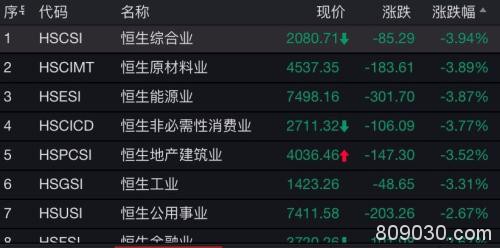 恒生12个行业板块全线尽墨,综合、原材料、能源板块跌幅居前。