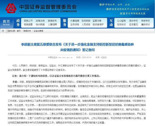 就如何贯彻五部委联合发布的《关于进一步强化金融支持防控新型冠状病毒感染肺炎疫情的通知》(简称《通知》),证监会副主席李超接受了记者的采访。节假日期间出台相关举措,显示了监管层稳定市场,呵护市场的意图,多项特殊时期作出特别政策安排,尊重市场规律,体现监管弹性,为受疫情严重影响的地区、企业、投资者尽快渡过难关全力提供金融支持,让资本市场的监管更有温度、更暖人心。