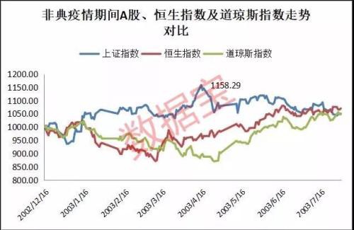 非典疫情对经济、民生、证券市场的影响都比较显著。大盘自2003年4月15日走出阶段高峰后震荡下跌,截至同年7月末,上证指数下跌8.62%。相比之下,香港恒生指数及道琼斯指数仅有短暂下跌,随后震荡上涨。