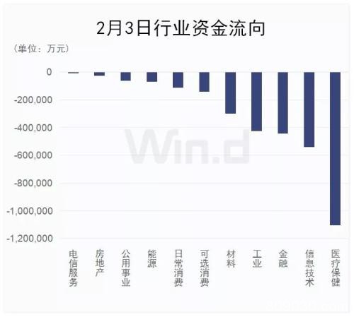 从2月3行业主力资金流向来看,主力资金净流出320多亿元,所有板块均净流出。考虑到多数个股跌停缺乏流动性,主力资金净流出最多的是医疗保健板块,净流出110多亿元,同时也反映出市场对医疗保健板块的分歧较大。此外,信息技术、金融、工业板块净流出金额均超过40亿元。