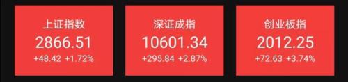 本周一之后,A股连飙三日。今日,上证指数收涨1.72%,报2866.51点;深证成指涨2.87%,报10601.34点;创业板指涨3.74%,重回2000点并创出逾三年新高。两市成交超9000亿元,达到9130亿元,且连续三日超过8700亿,为近10个月以来首次。