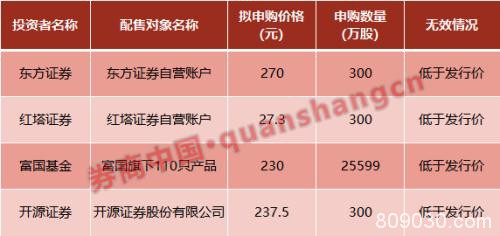 在初步询价中,共有4家投资者管理的113个配售对象申报价格低于本次发行价格271.12元/股,对应的拟申购数量总和为26,499万股。其中,3家低于发行价由券商的自营账户给出。