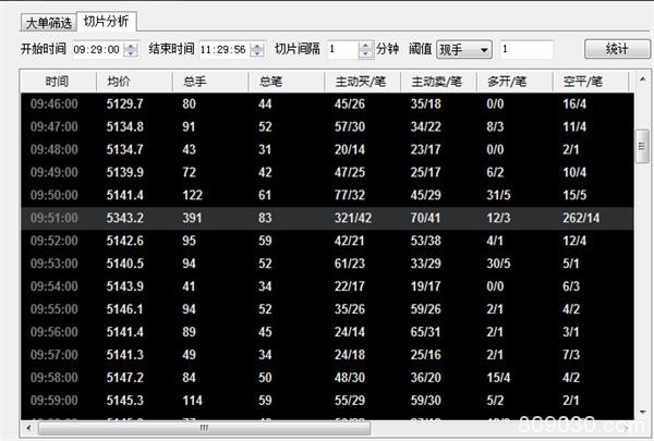数据显示,09:51,一分钟内主动买一共是42笔321手,主动卖是41笔70手,多头开3笔12手,空头平14笔262手。一分钟成交391手,成交均价5343.2点。