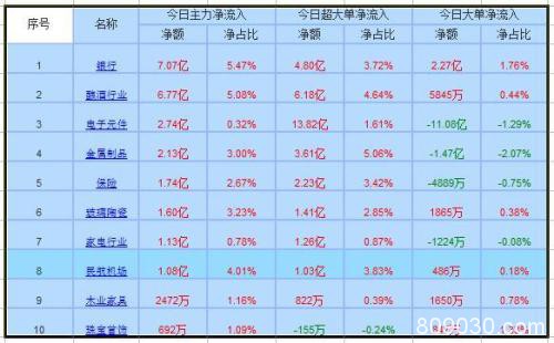 从两市行业板块资金流向来看,银行板块主力资金净流入7.07亿,酿酒板块主力资金净流入6.77亿,电子元件行业板块主力净流入2.74亿,金属制品板块主力资金净流入2.13亿,保险板块主力净流入1.74亿,从市场个股资金流向来看,获得主力资金净流入排名前十情况如下:
