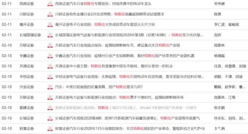 特斯拉概念股的突出表现,自然少不了卖方机构和买方机构的参与。Wind数据显示,以特斯拉作为关键词进行研报搜索,截至2月11日,今年以来的券商研报数量便达到171篇之多,相当于每个交易日便有7.4篇研报出炉。
