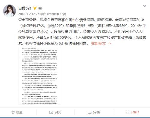 此前,甘薇朋友圈发文谈贾跃亭破产一事:从“老大”到“老赖”是创业者的世态炎凉。