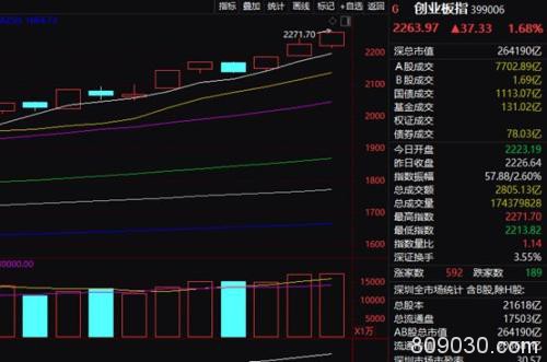 其中创业板指数表现强劲,再次大涨1.68%,收报2263.97点,盘中触及2271.70点,创下2016年8月以来新高。