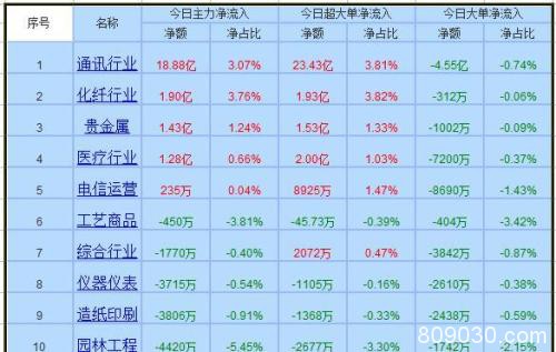 从两市行业板块资金流向来看,通讯板块主力资金净流入18.88亿,化纤板块主力资金净流入1.90亿,贵金属板块主力净流入1.43亿,医疗板块主力资金净流入1.28亿,电信运营板块主力净流入235万,从市场个股资金流向来看,获得主力资金净流入排名前十情况如下: