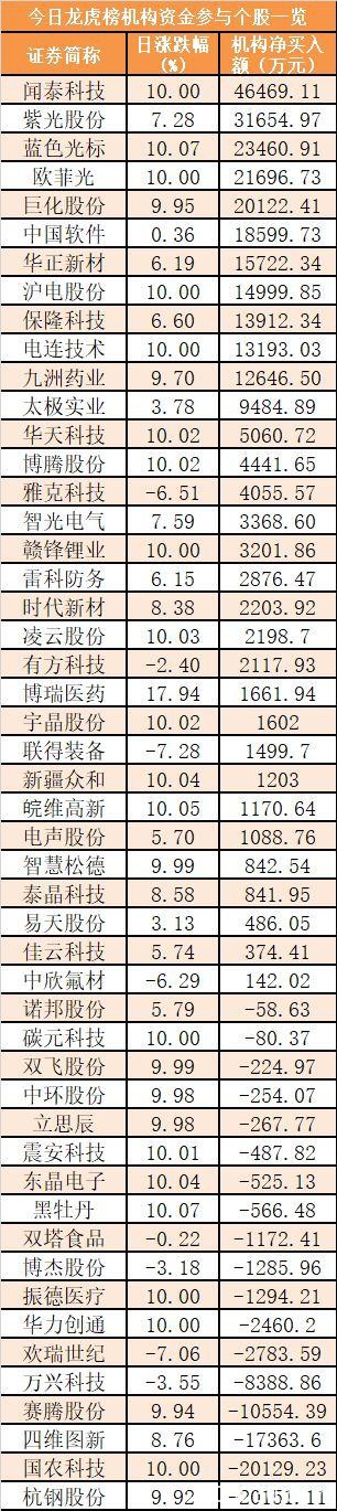 盘后龙虎榜数据显示,机构现身50股,其中闻泰科技(行情600745,诊股)等32股呈现机构资金净买入,杭钢股份(行情600126,诊股)等18股呈现机构资金净卖出。