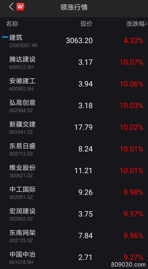 Wind数据显示,截至午间收盘,30个中信一级行业中,建筑板块以4.32%的涨幅居首,腾达建设(行情600512,诊股)、安徽建工(行情600502,诊股)、新疆交建(行情002941,诊股)、维业股份(行情300621,诊股)等多只个股封板,中国交建(行情601800,诊股)大涨逾7%,中国电建(行情601669,诊股)拉涨逾6%,中国铁建(行情601186,诊股)、中国建筑(行情601668,诊股)分别跟涨5%、4%,这四家“中”字头的基建公司堪称四“建”齐发。半日涨幅超5%的个股便有20只以上。
