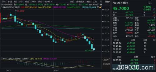 纽约交易所NYMEX原油期货在北京时间2月28日(即美东时间2月27日夜盘时间)再度下挫,截止到发稿时间报价45.70美元/桶,跌幅达到2.95%。
