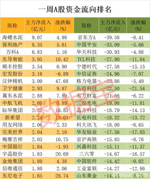个股方面,剔除近一个月上市的次新股,本周共37股主力资金净流入超亿元,股票数量较上周下降逾百只。水泥行业龙头海螺水泥(行情600585,诊股)主力资金净流入9.07亿元居首,该股本周大涨4.98%。地产行业龙头保利地产(行情600048,诊股)主力资金净流入为8.35亿元,本周上涨5.61%。本周净流入规模较大还有的万科A(行情000002,诊股)、先导智能(行情300450,诊股)、顺丰控股(行情002352,诊股)、宏发股份(行情600885,诊股)、汉钟精机(行情002158,诊股)等。