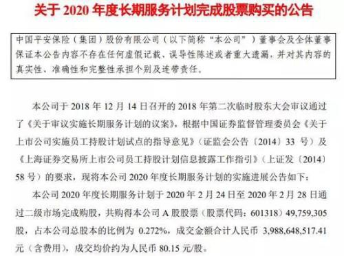 值得注意的是,中国平安(行情601318,诊股)3月1日发布公告称,2020年度核心人员持股计划于2月24日至27日通过二级市场完成购股,2020年度长期服务计划于2月24日至28日通过二级市场完成购股,合计成交金额超过46亿元。