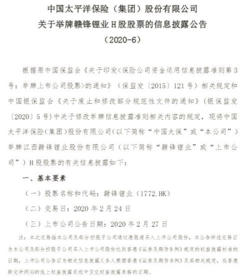 在此次举牌前,太保集团及子控股子公司持有赣锋锂业H股股票791.72万股,占赣锋锂业已发行H股股票的3.95%。加上已持有股票,太保集团及子控股子公司合计持有的赣锋锂业H股股票达到1032.24万股,占赣锋锂业已发行H股股票的5.16%。