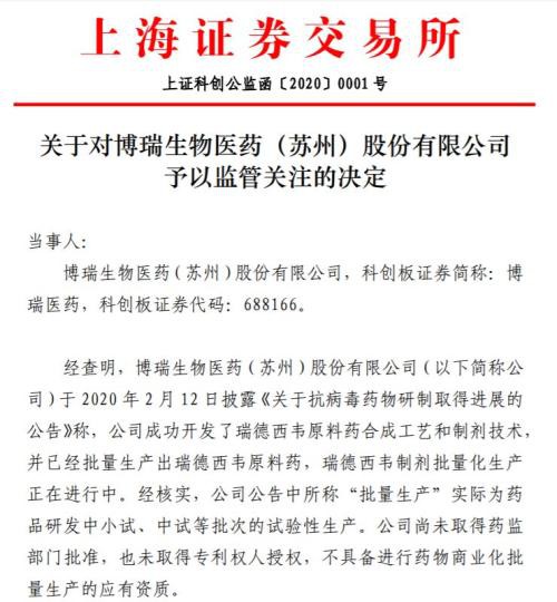 此外,上交所下发公告,对科创板公司江苏博瑞医药予以监管关注,并对其时任董事会秘书王征野予以通报批评。