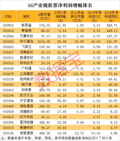 从业绩数据来看,受益于5G行业的高增长,多家5G产业链公司去年业绩预喜。数据显示,新易盛、爱施德(行情002416,诊股)、杰赛科技、中兴通讯、飞荣达(行情300602,诊股)等公司预计去年净利润翻倍增长。新易盛业绩快报显示,公司中高速率光模块营业收入及毛利率较上年同期显著增长,去年净利润为2.13亿元,同比增长5.69倍。
