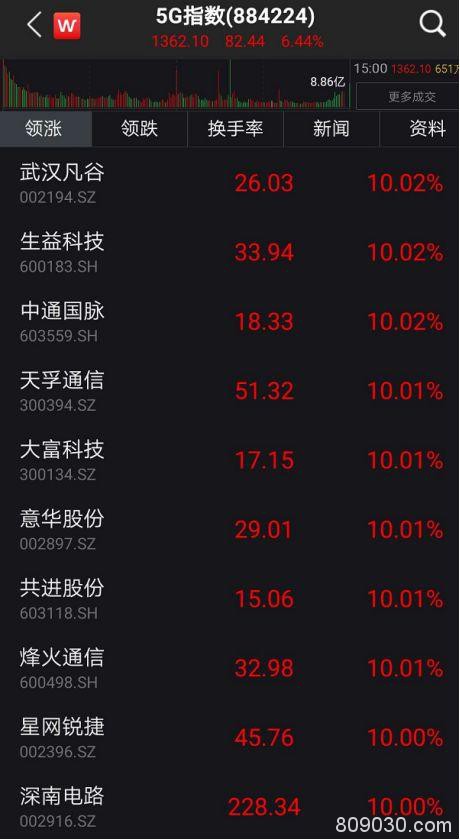 当天盘面上,大基建、房地产等板块双双爆发。而其中,以5G为代表的通信类板块也同样令人惊艳。