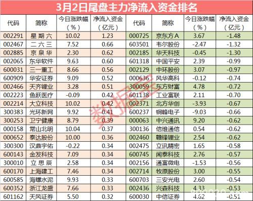 从个股尾盘资金流向数据看,有7股尾盘净流入资金超过5000万元,星期六(行情002291,诊股)、二六三(行情002467,诊股)、京泉华(行情002885,诊股)等个股尾盘资金净流入金额最多,分别高达1.23亿元、0.66亿元、0.62亿元;京东方A(行情000725,诊股)、韦尔股份(行情603501,诊股)、华天科技(行情002185,诊股)等个股尾盘资金净流出金额最多。