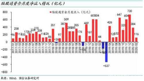 陆股通资金2月净入A股115.84亿元。从陆股通资金月度流动情况来看,陆股通2月净流入A股115.84亿元,其中沪股通净流入87.98亿元,深股通净流入27.86亿元。从周度外资流动来看,2月前3周外资均呈现持续净流入的趋势,第4周由于海外国家新冠疫情扩散风险加大,全球权益市场均出现了大幅下跌,导致外资大规模流出,单周净流出293.41亿元,为沪深港通开通以来单周资金流出次高值。