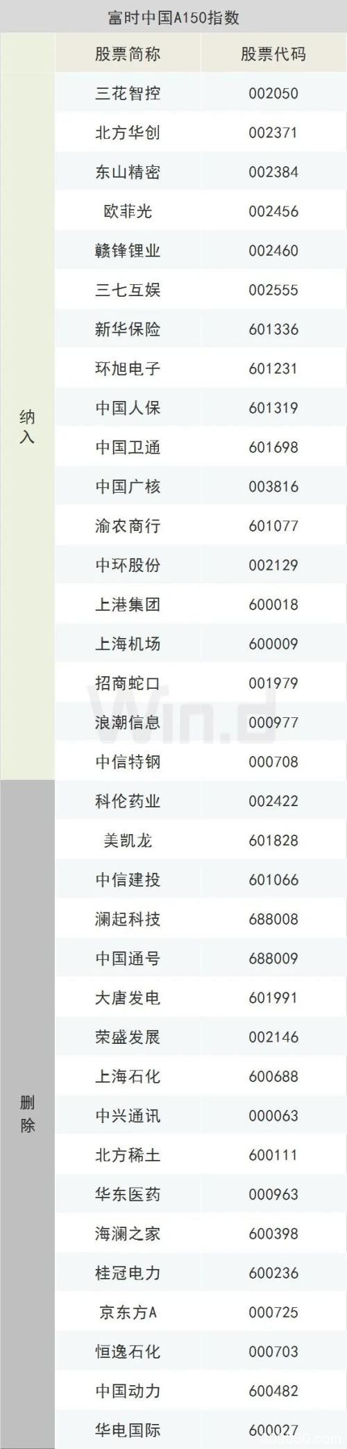 富时中国A150指数将纳入三花智控(行情002050,诊股)、北方华创(行情002371,诊股)、东山精密(行情002384,诊股)、欧菲光(行情002456,诊股)、赣锋锂业(行情002460,诊股)等18只个股,同时删除科伦药业(行情002422,诊股)、美凯龙(行情601828,诊股)、中信建投、澜起科技(行情688008,诊股)等17只个股。
