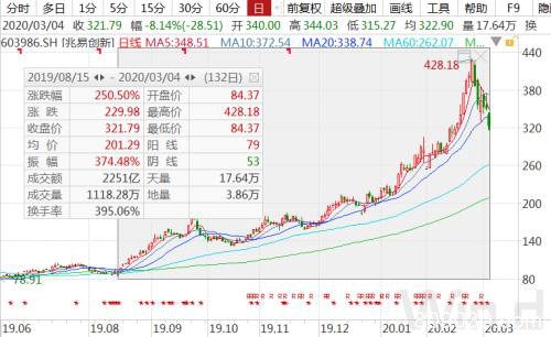 作为半导体板块的龙头,兆易创新(行情603986,诊股)去年8月份以来涨幅达250%,最高涨幅一度超过300%,虽然近日股价出现回调,但绝对涨幅依旧较大,且公司动态市盈率高达200倍,短期存在估值过高风险。3月4日,公司股价盘中一度跌停,最终收盘仍大跌8.14%。