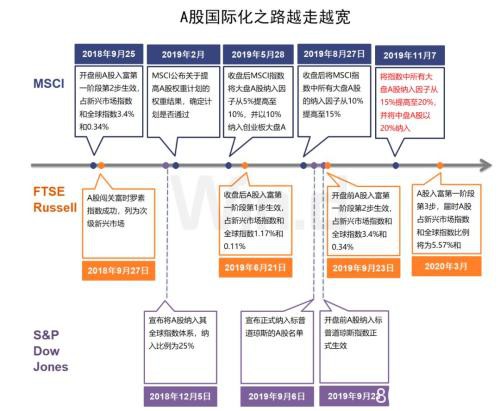 回顾2019年A股国际化进程可谓是有序落地,分别完成了在MSCI指数扩容的三步走,以及首次纳入富时罗素和标普道琼斯两大国际指数。