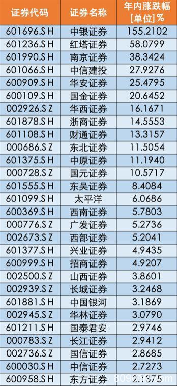 中银证券(行情601696,诊股)、红塔证券(行情601236,诊股)、南京证券、中信建投、华安证券、国金证券(行情600109,诊股)领跑,年内涨幅达到155.21%、58.08%、38.34%、27.93%、25.48%和20.65%。