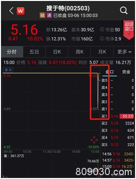3月6日下午,口罩概念股搜于特尾盘也表演了一把炸板剧情,股价迅速从涨停板位置快速下落,逼近翻绿,不过两分钟后,资金再次涌入,股价重新封板。而这也是搜于特第六次收下涨停板。