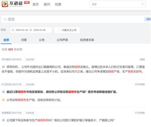 在投资者互动平台上,不少上市公司也被询问:是否涉及参与生产熔喷布布料?产能是否能够跟上?这也意味着市场资金对口罩股尤其是涉及生产熔喷布原料的企业关注度颇高。