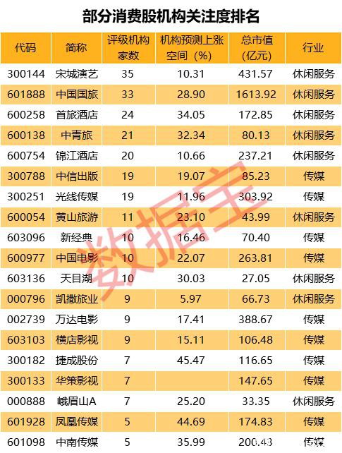部分股票获机构高关注度,数据显示,上述消费股中有19只获5家以上机构评级,包括宋城演艺、中国国旅(行情601888,诊股)、中公教育(行情002607,诊股)、首旅酒店(行情600258,诊股)、中青旅(行情600138,诊股)等。
