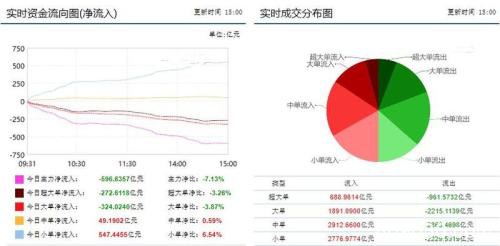 从两市资金流向来看,截止收盘,沪深两市主力资金呈现大幅净流出状态,两市共流出596.6357亿元。其中,超大单净流出272.618亿元,大单净流出324.0240亿元,中单净流入49.1902亿,小单净流入547.4455亿元。