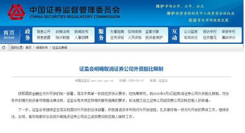 按照国家金融业对外开放的统一部署,落实中美第一阶段经贸协议要求,经统筹研究,自2020年4月1日起取消证券公司外资股比限制,符合条件的境外投资者可根据法律法规、证监会有关规定和相关服务指南的要求,依法提交设立证券公司或变更公司实际控制人的申请。