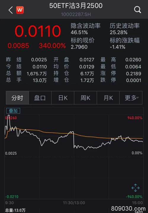 受大跌此影响,今日早盘50ETF、300ETF认沽期权普遍出现了大幅上涨。其中,3月看涨合约中部分品种涨幅靠前。50ETF认沽期权中,50ETF沽3月2500一度大涨940%,50ETF沽3月2550盘中最高涨幅917.14%,50ETF沽3月2600盘中最高涨幅也超过500%。