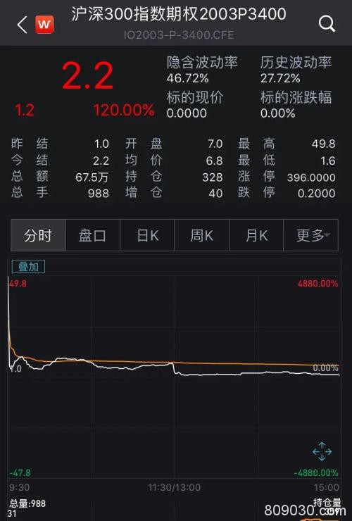 在此情况下,沪深300、300ETF、50ETF等股票类认沽期权盘中都出现了大涨,其中300ETF沽3月3400合约盘中一度暴涨3535%,相当于一天1万变35万,另外中金所沪深300股指期权沽3月3400合约更是最高涨至48倍。