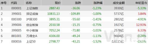 3月13日,沪深两市小幅下跌,截至收盘,上证综指跌1.23%报收于2887.43点;深成指跌1.00%报收于10831.13点;创业板指跌0.75%报收于2030.58点,万得全A总成交9600多亿元。