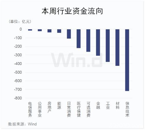 从本周行业主力资金流向来看,净流出2500多亿元,所有板块均为净流出。其中,信息技术板块净流出最多,超过700亿元,材料板块紧随其后,净流出400多亿元;此外,工业、金融、可选消费等板块净流出额亦较多。可见,在市场整体回调的背景下,主力资金亦开始回撤。