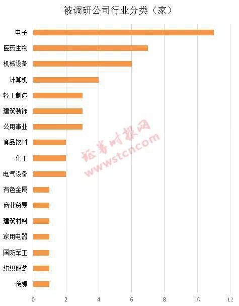 按行业分类看,上周被调研公司中,电子行业涉及的公司数量最多,有11家。医药生物、机械设备两大行业被调研的公司数量分列二三位,分别有7家和6家。