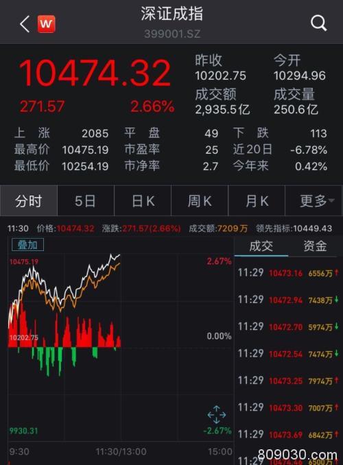 Wind数据显示,截至午间收盘,上证指数涨1.26%,报2814.70点;深证成指涨2.66%,报10474.32点;创业板指涨3.25%,报1980.00点。