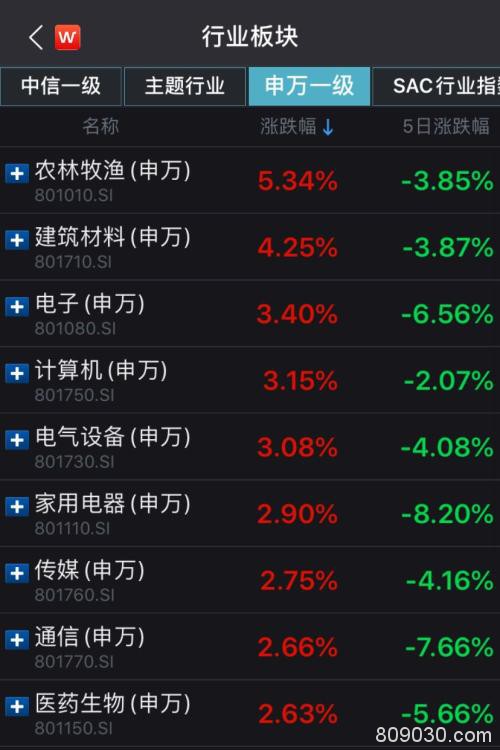 申万一级28个行业板块中,仅有房地产板块小幅下跌,其余全部上涨。农林牧渔板块以5.34%的涨幅领涨,建筑材料、电子、计算机、电气设备板块纷纷跟涨。