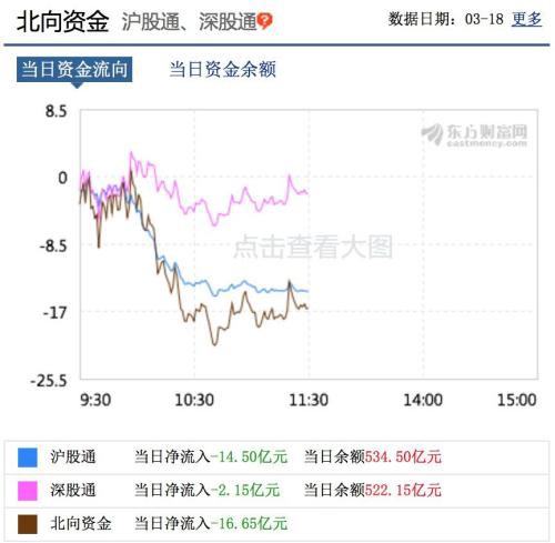 3月18日,北向资金延续净流出态势。据东方财富(行情300059,诊股)数据,截至午间收盘,北向资金半日合计净流出16.65亿元,其中沪市港股通净流出14.50亿元,深市港股通净流出2.15亿元。